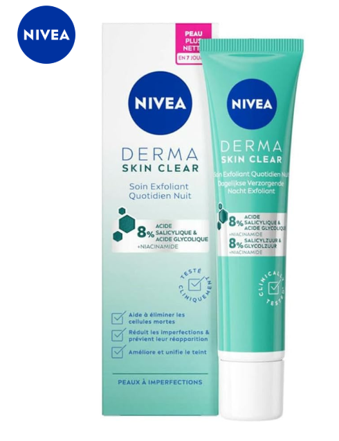 Le soin de nuit de Nivea associe trois actifs puissants — l’acide salicylique, l’acide glycolique et la niacinamide — pour transformer visiblement la peau pendant le sommeil. Cette synergie d’ingrédients exfolie en douceur, désobstrue les pores, régule l’excès de sébum et favorise une peau plus lisse, plus nette et éclatante au réveil. Parfait pour les peaux sujettes aux imperfections ou au teint terne.