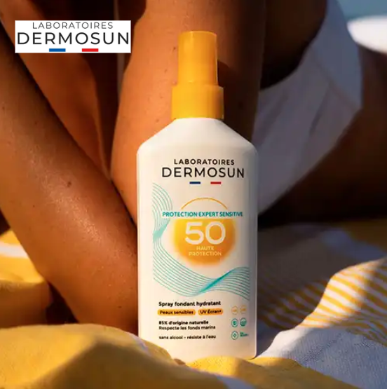 Le spray Protection Expert Sensitive SPF50 des Laboratoires DERMOSUN est spécialement conçu pour offrir une protection solaire très haute aux peaux sensibles et réactives. Sa formule avancée aide à protéger efficacement la peau contre les rayons UVA et UVB tout en respectant son équilibre naturel. Sa texture légère et non collante pénètre rapidement, laissant la peau confortable et protégée.